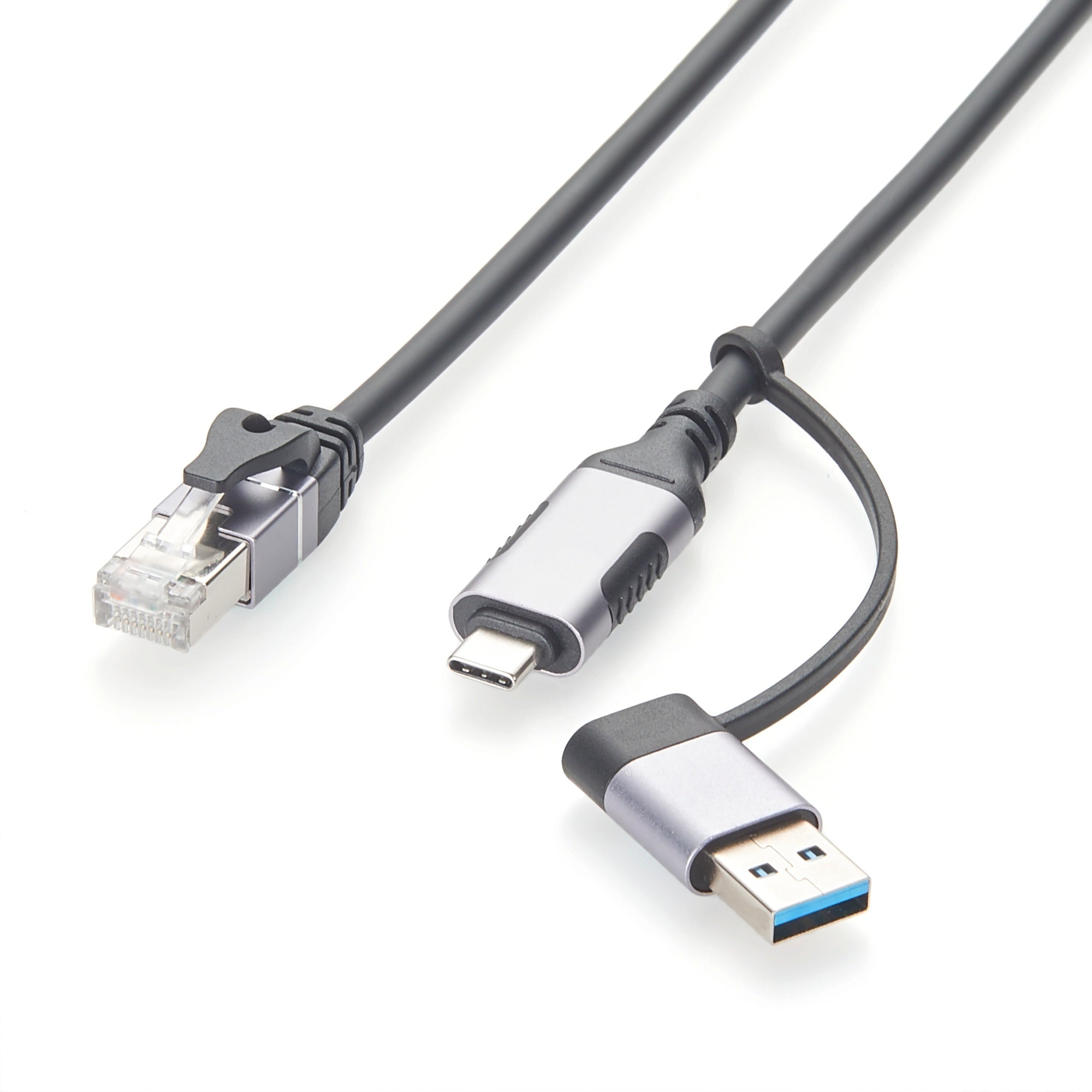 The 2-in-1 USB-A USB-C to RJ45 Rollover Console Cable is designed for configuring and managing network devices through a standard RJ45 console port. Featuring a USB-A USB-C 2-in-1 input design, this cable allows direct connection to modern laptops without the need for additional adapters.