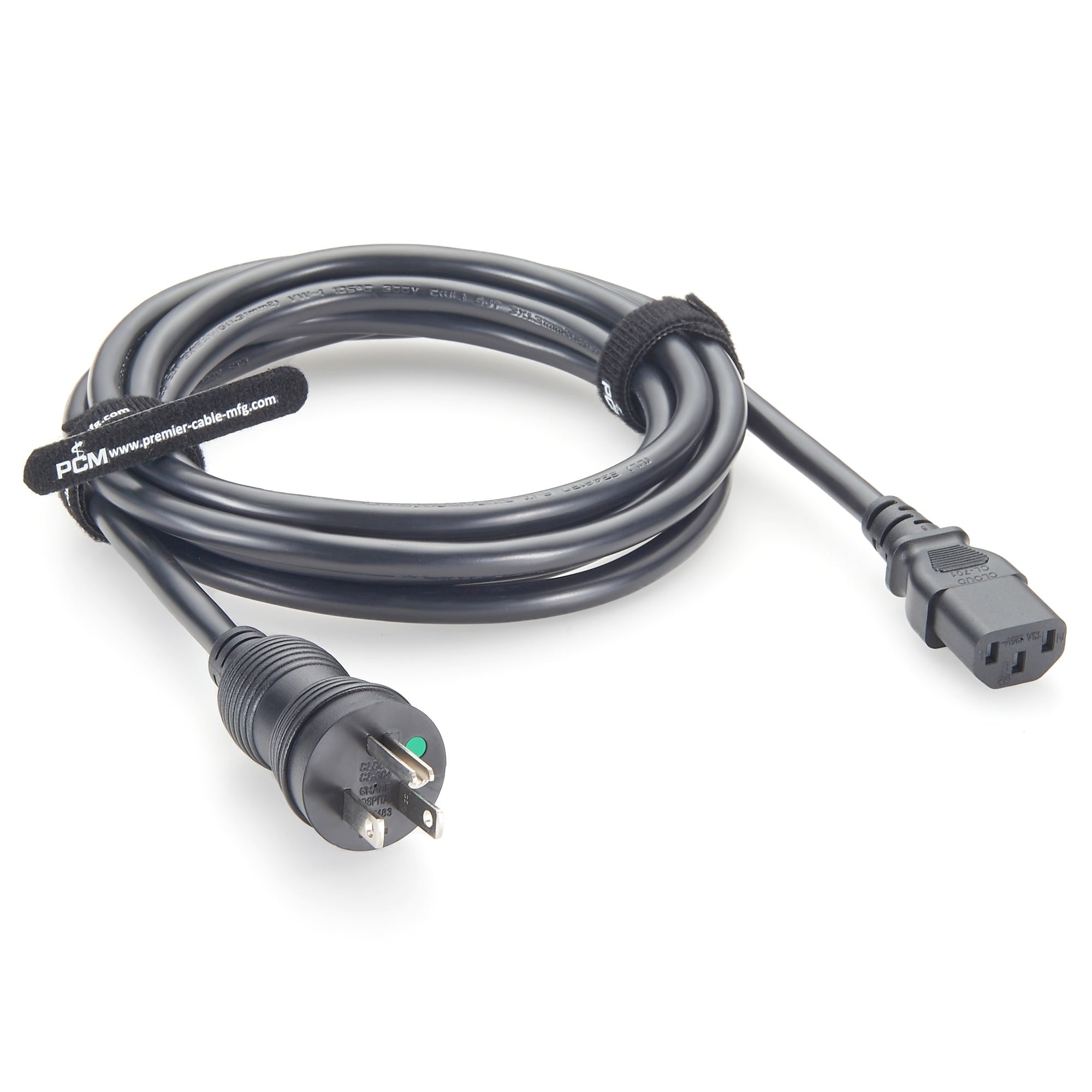The Premier Cable PCM-YD-0002 is a hospital-grade medical power cord with NEMA 5-15P and IEC 60320 C13 connectors, designed for safe and reliable power delivery in medical and healthcare environments. Featuring 3 x 16AWG SJT construction and a 10 ft (3050mm) length, this Hospital Grade Green Dot Power Cord provides high current capacity (rated at 13A/125V) and ensures long-term durability under rigorous hospital environments.